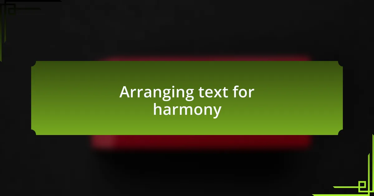 Arranging text for harmony requires a thoughtful approach to how elements interact with one another. I recall a time when I adjusted the line spacing on a project, which made a significant difference in readability. That simple tweak created a flow that felt inviting and made the text breathe, almost as if it was sharing a gentle story with the reader. Have you ever noticed how tightly spaced text can make you feel overwhelmed or rushed?
