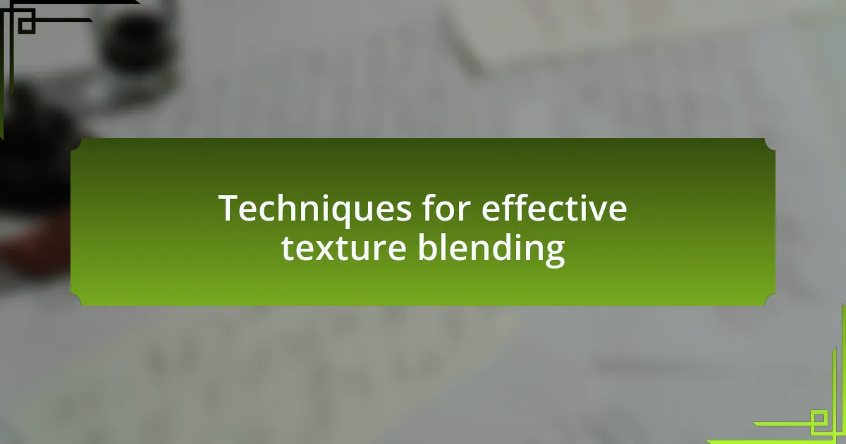 When blending textures in lettering, one technique I find incredibly effective is experimenting with opacity settings. By adjusting the transparency of my textures, I can create a sense of depth and layering without overwhelming the letterforms. I once crafted a piece where I combined a bold typeface with a weathered wood texture at 70% opacity—this subtle integration provided an inviting warmth that felt so alive.
