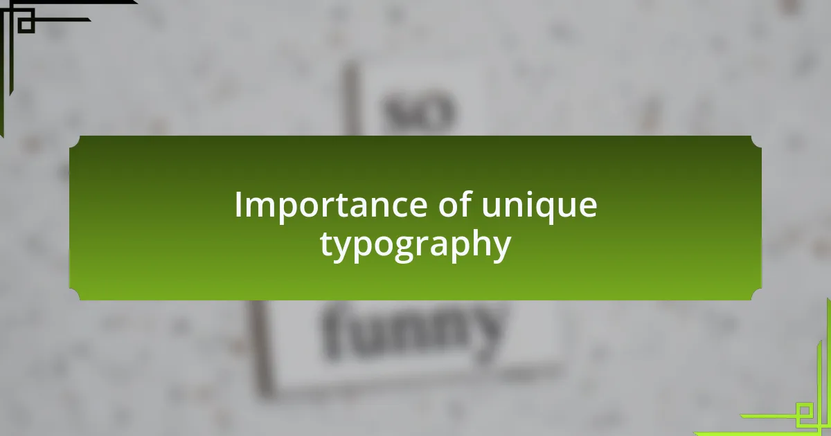 Unique typography is crucial because it establishes a brand’s identity and can differentiate it in a saturated market. I often reflect on a project where I used an unconventional typeface that perfectly matched the brand’s quirky personality. It was exhilarating to see how that choice not only caught attention but also resonated with the audience, sparking conversations about the design. Isn’t it fascinating how the right font can make a brand feel more relatable?