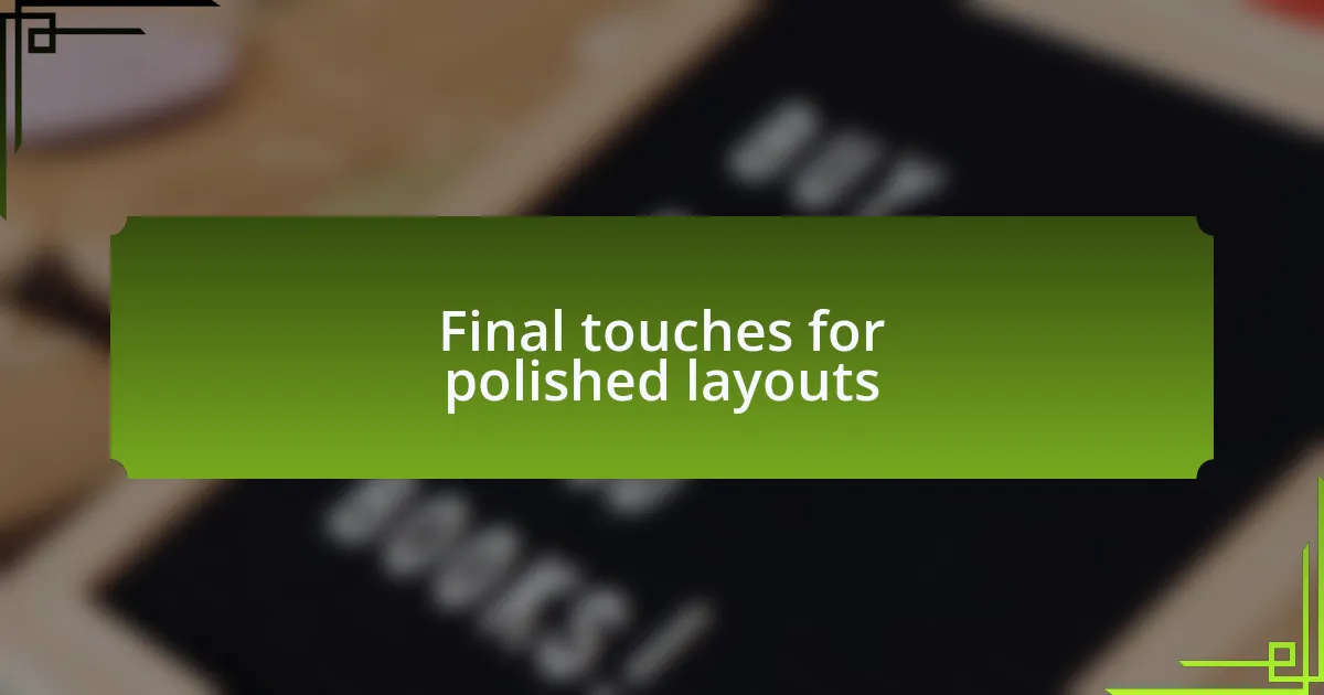 Creating polished layouts isn’t just about getting the basics right; it’s about layering in those final touches that really elevate your design. One of my go-to techniques involves fine-tuning spacing. I vividly remember a project where a slight adjustment in letter spacing turned a clunky layout into something effortlessly readable. Have you ever noticed how a little more space can give your letters room to breathe? It’s like magic.