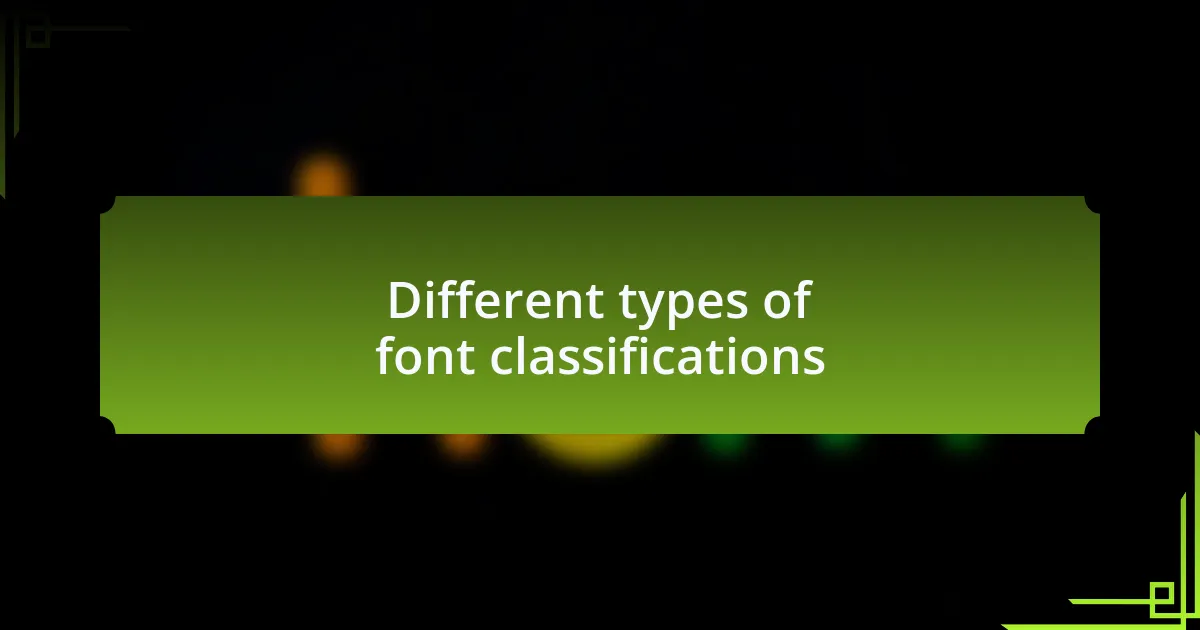 Font classifications can be broadly categorized into serif, sans-serif, script, and display fonts. I remember my first encounter with serif fonts during a typography workshop. The elegant curves and distinct “feet” reminded me of classic literature; they evoke a sense of tradition and reliability that I found comforting while designing a book cover.