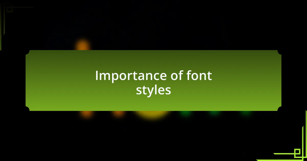 Font styles play a pivotal role in shaping a viewer’s perception of a message. I recall the time I experimented with a bold display font for a personal project; the instant impact it created still resonates with me. The font practically shouted at the audience, grabbing their attention and conveying urgency—proof that the right typeface can truly alter the narrative.