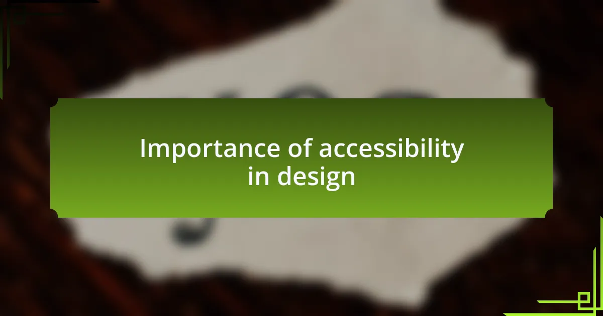 Accessibility in design is crucial because it allows everyone, regardless of their abilities, to engage with content. I once worked with a client whose website was visually stunning, but many users struggled to read the text due to poor color contrast. This experience was a powerful reminder for me: good design means nothing if it excludes people.
