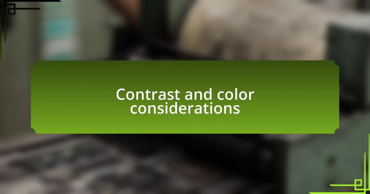 When I think about contrast and color in typography, I’m reminded of a project where color choices made all the difference. I once designed a promotional poster, and after settling on a bright orange background, I realized that the white text looked washed out. It was a simple mistake, but it taught me the importance of testing color combinations in different lighting. How freely can your audience engage with content if they have to struggle with legibility? I found that ensuring high contrast is paramount to keeping that engagement flowing smoothly.