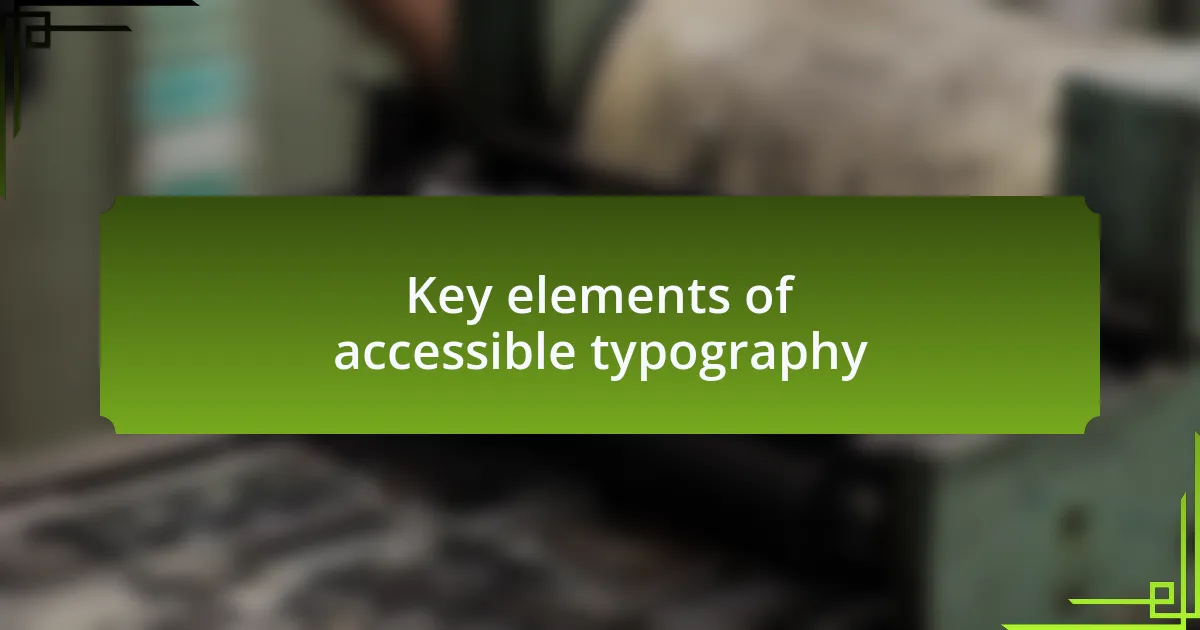 When focusing on accessible typography, one of the key elements is font choice. I once worked on a project where we decided to use a sans-serif typeface for its simplicity and clarity. This small decision made a significant difference, as sans-serif fonts tend to be more legible on screens and in print, especially for those with reading disabilities. Have you ever noticed how certain fonts feel more welcoming than others?