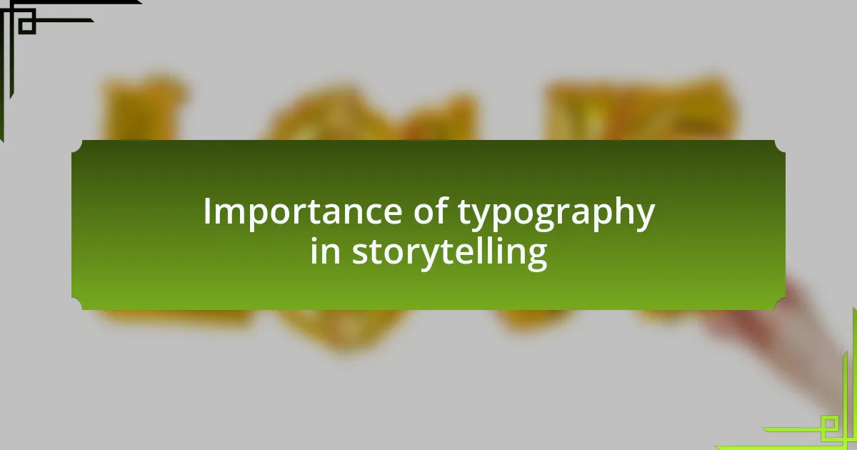 Typography plays a critical role in storytelling by setting the tone and mood of the narrative. I remember reading a book where the typeface changed with the storyline—bold, sharp fonts during climactic moments and softer, rounded ones in reflective passages. It made me wonder: how often do we overlook the profound impact that type can have on the emotions we experience while reading?