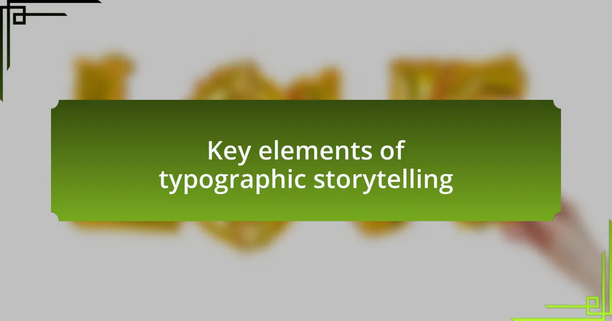 A key element of typographic storytelling is the deliberate choice of typefaces. I remember collaborating on a brand identity project where we selected a vintage serif font to evoke nostalgia. As we worked through different options, it was fascinating to see how each typeface conjured a distinct feeling, shaping perceptions before a single word was read. Isn’t it incredible how a font can whisper its backstory even before the narrative begins?