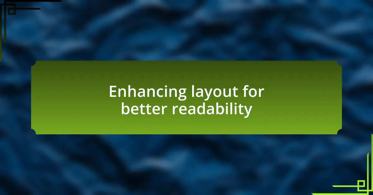 When enhancing layout for better readability, I often reflect on a design I executed for a fundraising brochure. I spaced the text effectively, creating breathing room between paragraphs and sections. This subtle change transformed the entire piece; instead of a dense block of text, it became a welcoming invitation to read, inviting clients to focus on the cause with ease. Have you ever noticed how some layouts seem to draw you in, while others push you away?