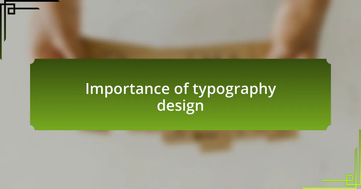 Typography design is crucial because it serves as the voice of a written message, influencing how content is received and understood. I recall struggling to read small, poorly spaced fonts during a presentation; it was frustrating and diverting. How often do we take for granted that our choice of typeface and layout can enhance or obscure precious information?