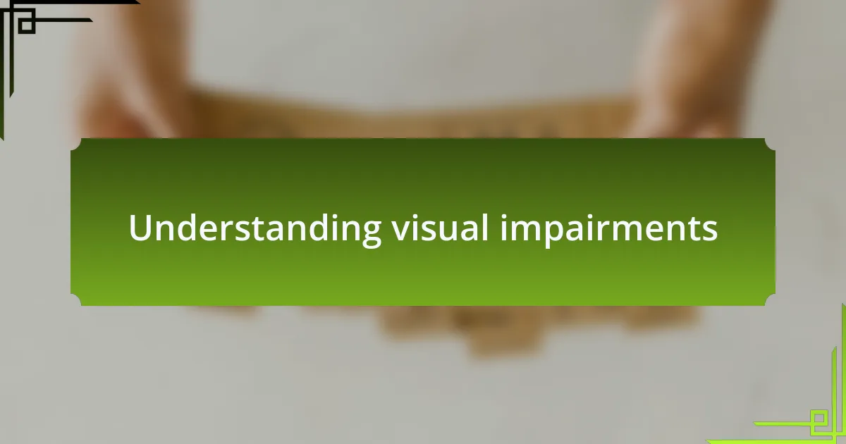 Understanding visual impairments requires a deeper look at how they affect daily life. I remember a moment when a friend shared their experience of navigating a crowded street with limited visibility. Their struggle highlighted the challenges that those with visual impairments face, sparking a realization for me about the importance of inclusive design.
