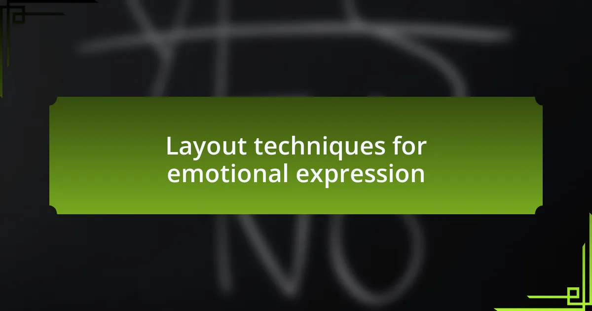 Layout techniques can significantly amplify emotional expression in typography. I once experimented with whitespace by placing a bold typeface at the center of a landing page, and the effect was striking. The emptiness around it created a sense of importance and urgency, guiding the user’s focus straight to the call-to-action. Isn’t it fascinating how simply adjusting space can evoke such powerful feelings?