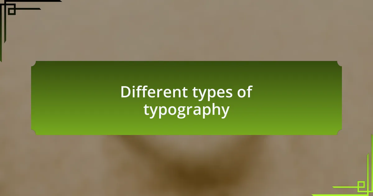 When discussing the different types of typography, I often find it fascinating how each category serves a unique purpose. For instance, serif fonts like Times New Roman evoke a sense of tradition and trustworthiness. I recall using a serif typeface for a historical web project; it breathed authenticity into the content and helped transport readers back in time. Isn’t it interesting how a single font choice can influence perception so profoundly?