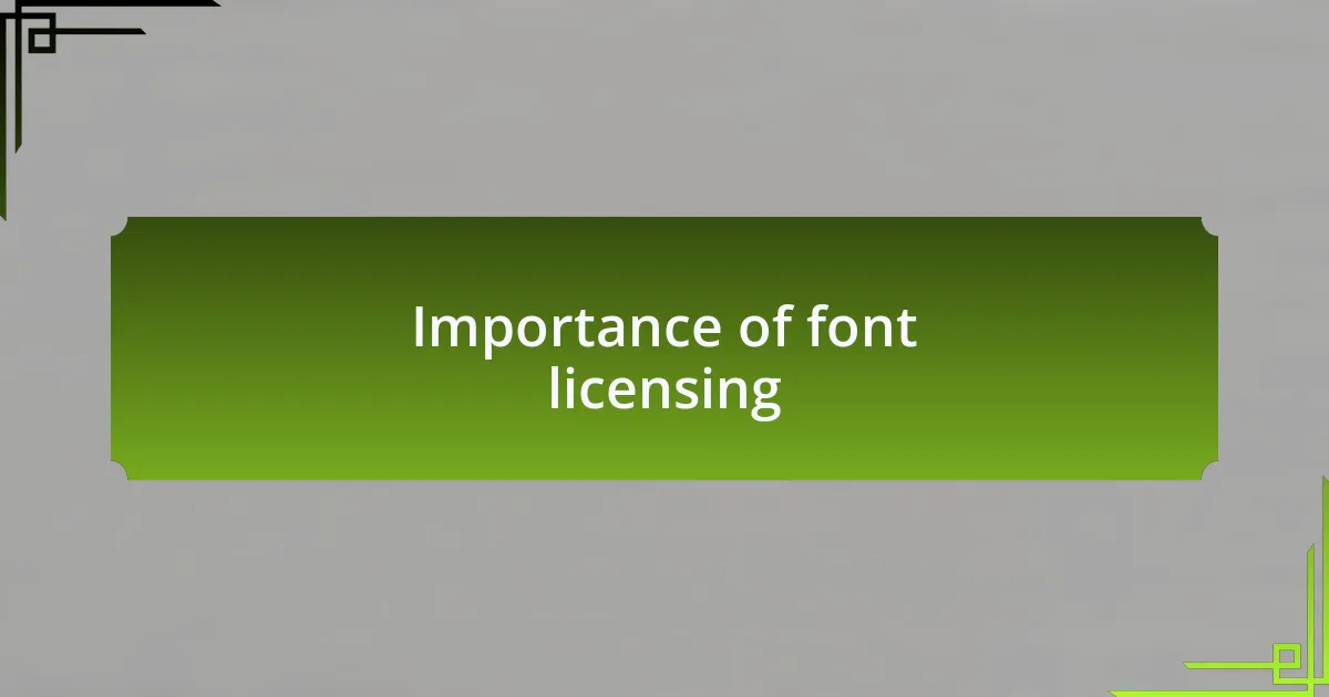 Font licensing plays a crucial role in protecting the rights of type designers while also safeguarding users from potential legal pitfalls. I can recall a time when I unknowingly used a font without the proper license, only to receive an alarming email from the type foundry. It was a stark reminder of how important it is to respect the work of those who create these beautiful typefaces.