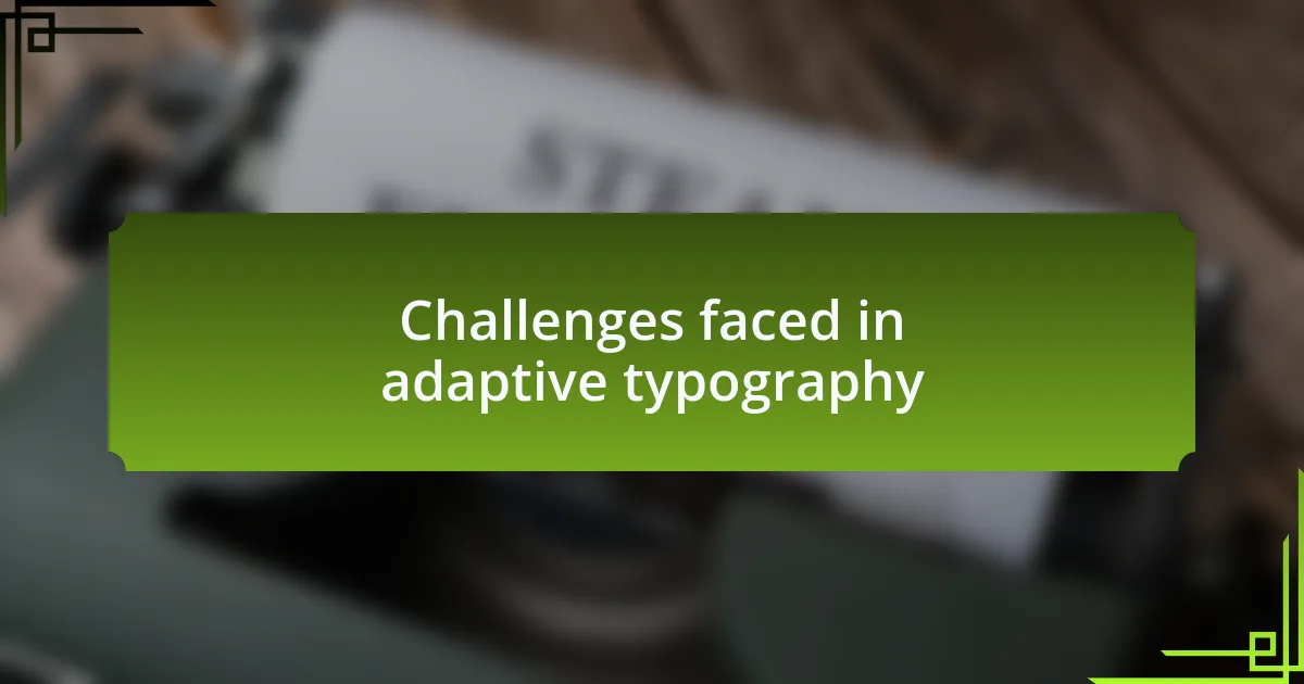 Working with adaptive typography certainly comes with its set of challenges. One significant hurdle I’ve faced is ensuring consistency across various devices. I once designed a site where the same font appeared drastically different on an older tablet compared to my high-resolution desktop. It left me questioning: how do we maintain a cohesive brand identity when users have such varied experiences?