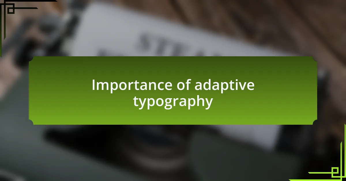Adaptive typography is crucial in creating a seamless user experience across different devices. I remember launching a website that initially looked great on a desktop but fell flat on mobile. By implementing adaptive typography, I could ensure that the text not only resized appropriately but also maintained clarity and impact. It was a game-changer that allowed the content to shine, regardless of the screen size.