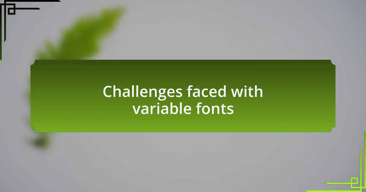 When I first ventured into the world of variable fonts, one significant challenge I faced was ensuring compatibility across different browsers. I vividly recall the frustration of noticing that a beautifully crafted font I was excited about rendered poorly in certain browsers. It made me realize how pivotal thorough testing is for web typography—after all, what’s the point of an innovative feature if it doesn’t look great everywhere? Have you ever had a similar experience where a design decision fell flat due to compatibility issues?