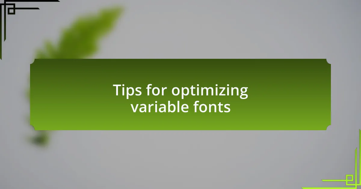 When optimizing variable fonts, the first tip I would share is to use only the necessary axes for your design. I remember a project where I included every axis available, thinking it would give me endless possibilities. However, the site became cluttered and confusing. Have you ever felt like too many options made your design less effective? Narrowing down to the most relevant axes not only cleans up your design but also improves performance.