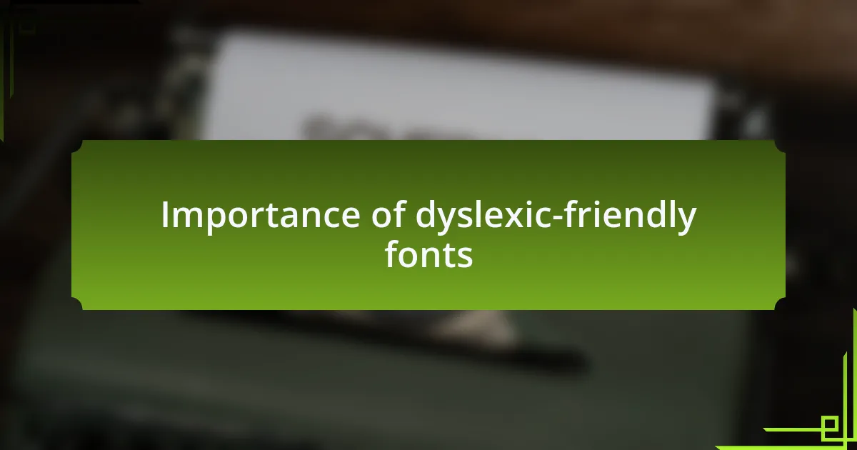 The significance of dyslexic-friendly fonts cannot be overstated. I remember a time when I was working on an educational brochure aimed at parents and teachers. Opting for a font designed for dyslexic readers not only improved comprehension but also made the material feel more inviting. It struck me then: if something as simple as a font could empower someone with dyslexia, how could I, as a designer, ignore its potential?