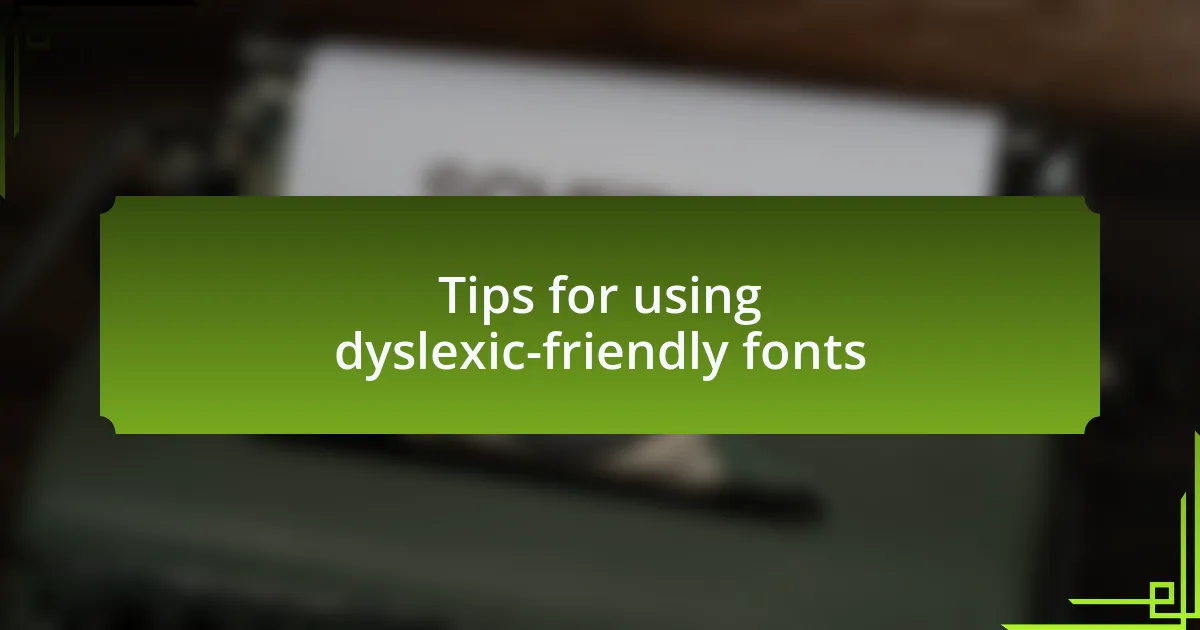When using dyslexic-friendly fonts, clarity is key. I remember working on a project where I tested different font sizes alongside the selected typeface, which made a noticeable impact on readability. I found that increasing the font size by just a couple of points made a world of difference, allowing readers to absorb information more comfortably. Have you ever noticed how a small change can make something feel so much more accessible?