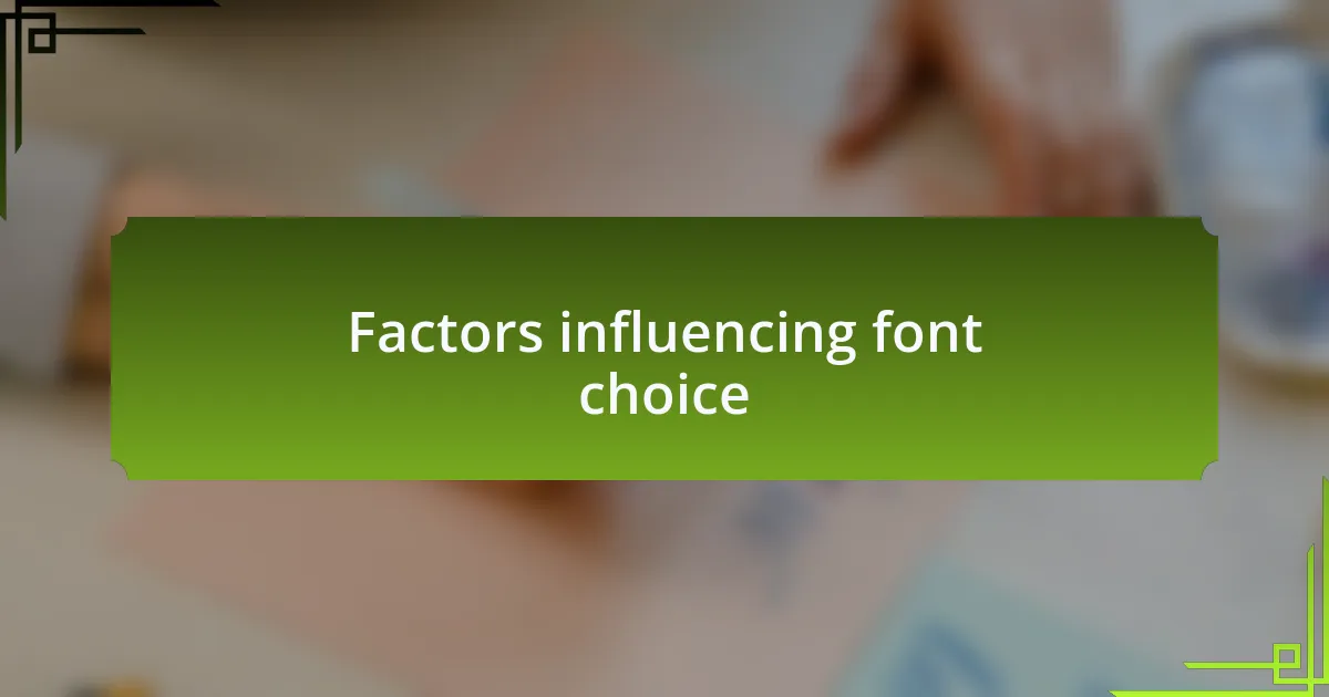 When I think about factors influencing font choice, the target audience always comes to mind first. For example, I once designed a flyer for a local art show aimed at college students. I opted for a trendy, bold font that resonated with their dynamic style, and the final product was a hit. It emphasized that understanding who will be viewing your work shapes the entire design strategy.