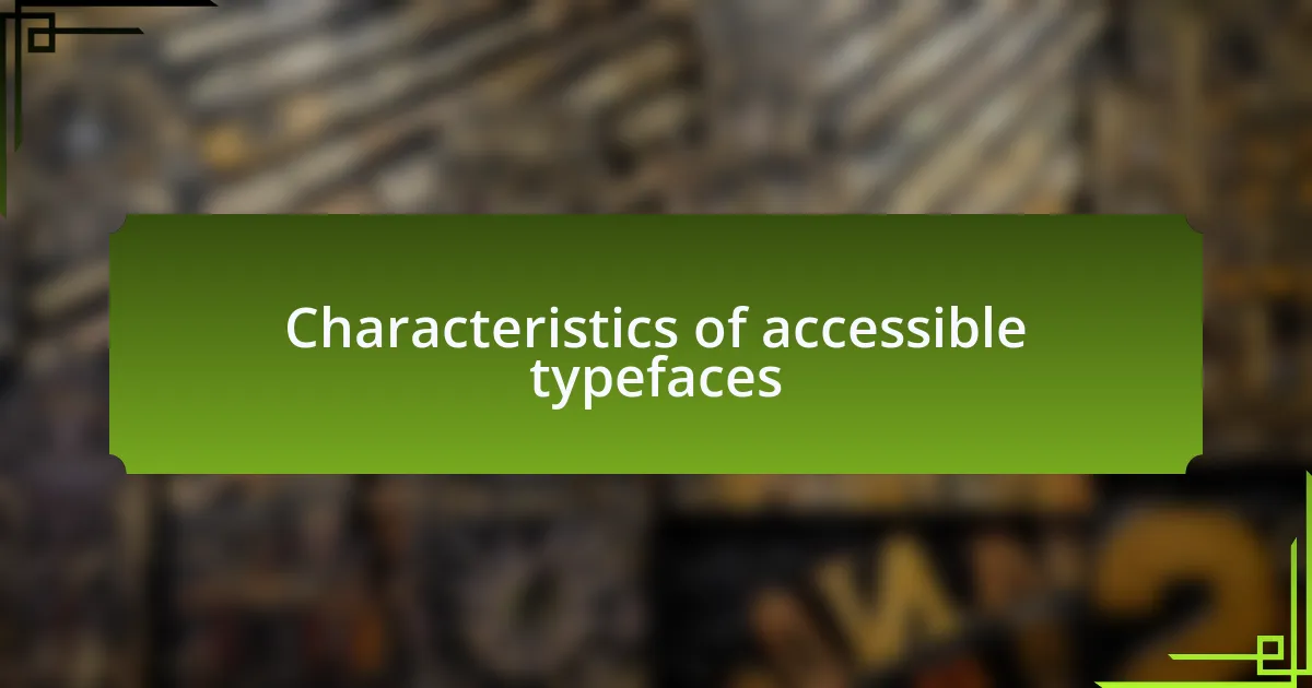 Accessible typefaces possess several defining characteristics that enhance readability. For instance, I often prioritize fonts with clear distinctions between similar letters, such as “l” (lowercase L) and “I” (uppercase i) or “O” (capital O) and “0” (zero). In one project, I switched to a typeface that highlighted these differences, and the feedback from users was overwhelmingly positive; their reading experiences were transformed.