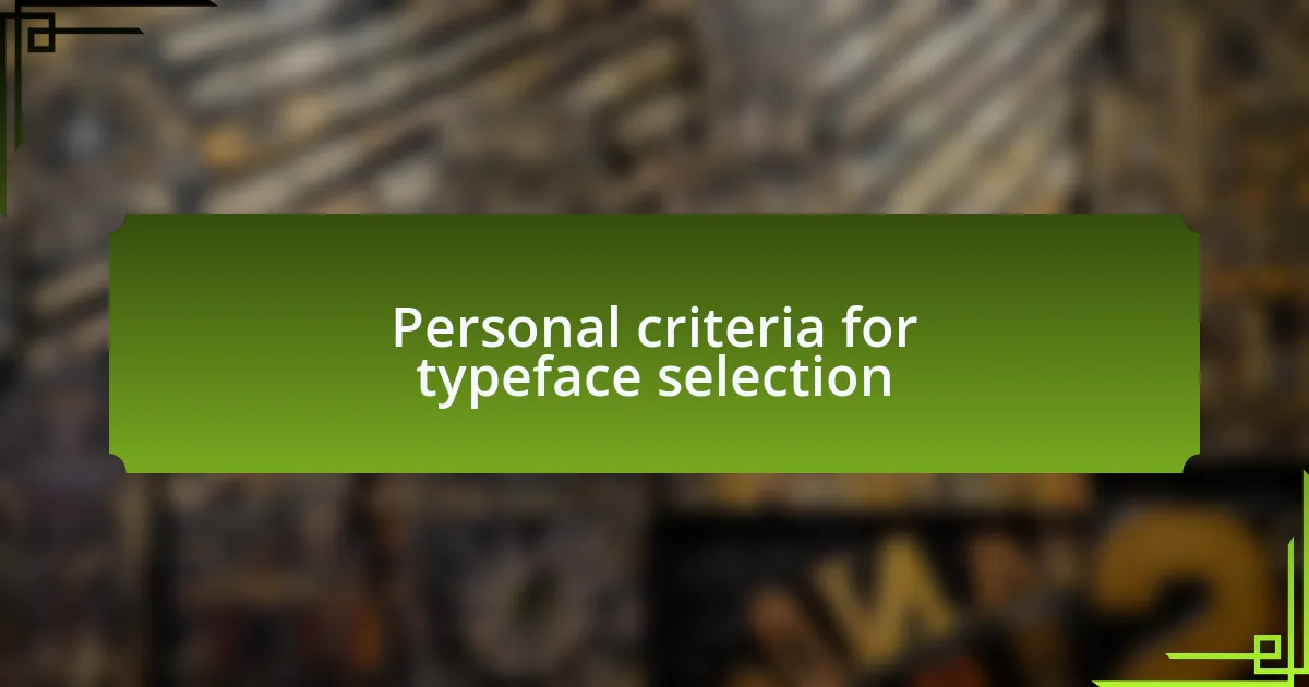 Another personal criterion I heavily weigh is the versatility of a typeface. I remember a time I invested in a script typeface that I thought would add charm to a wedding invitation. However, when I resized it for different formats, it lost its elegance and became unreadable. This experience taught me the importance of choosing a typeface that maintains its legibility and style across various applications. How many times have you experienced the frustration of a font failing to deliver when it mattered most?