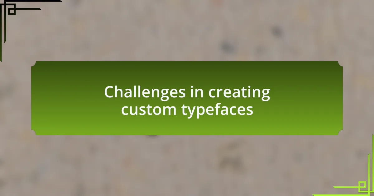 Creating custom typefaces comes with its share of hurdles. One significant challenge is the technical expertise required to bring a design to life. I remember when I first ventured into type design; I was excited, but the intricacies of vector graphics and kerning adjustments often left me feeling overwhelmed. Have you ever struggled to make a straightforward adjustment but found that it altered the entire appearance? It’s crucial to have a solid understanding of both design principles and the software used, or else the final product may not turn out as envisioned.