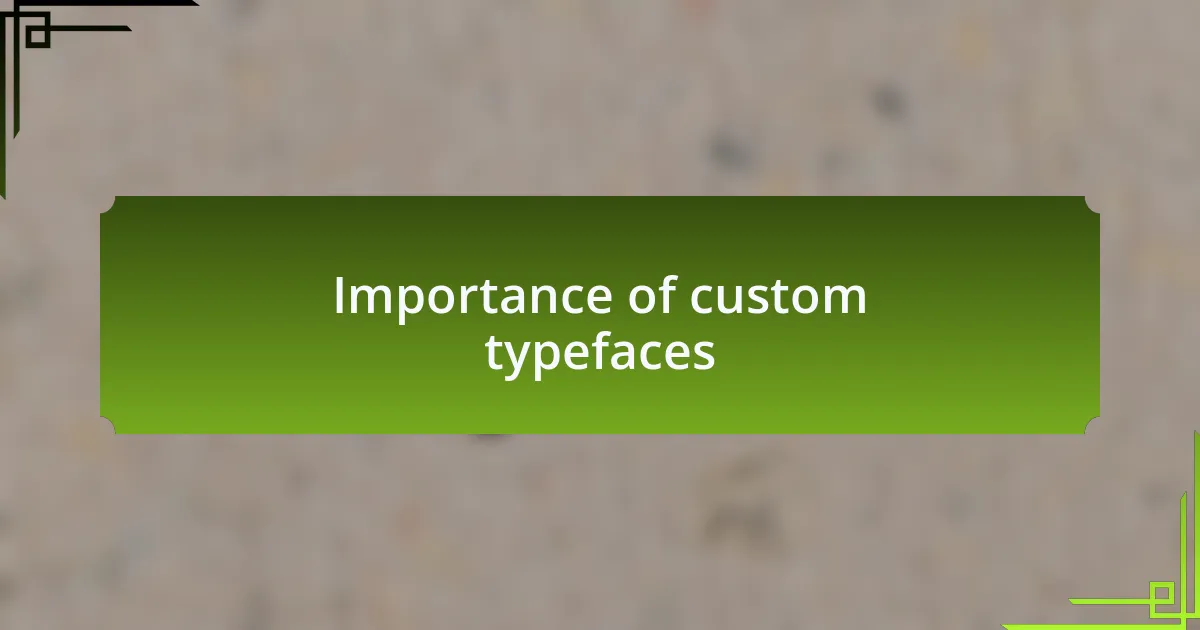 Custom typefaces play a crucial role in establishing a brand’s identity and voice. I remember collaborating on a project where we developed a unique typeface that perfectly encapsulated a client’s values. The moment we presented it, the client’s excitement was palpable; it wasn’t just a font, it was a visual story that conveyed their mission in a single glance.