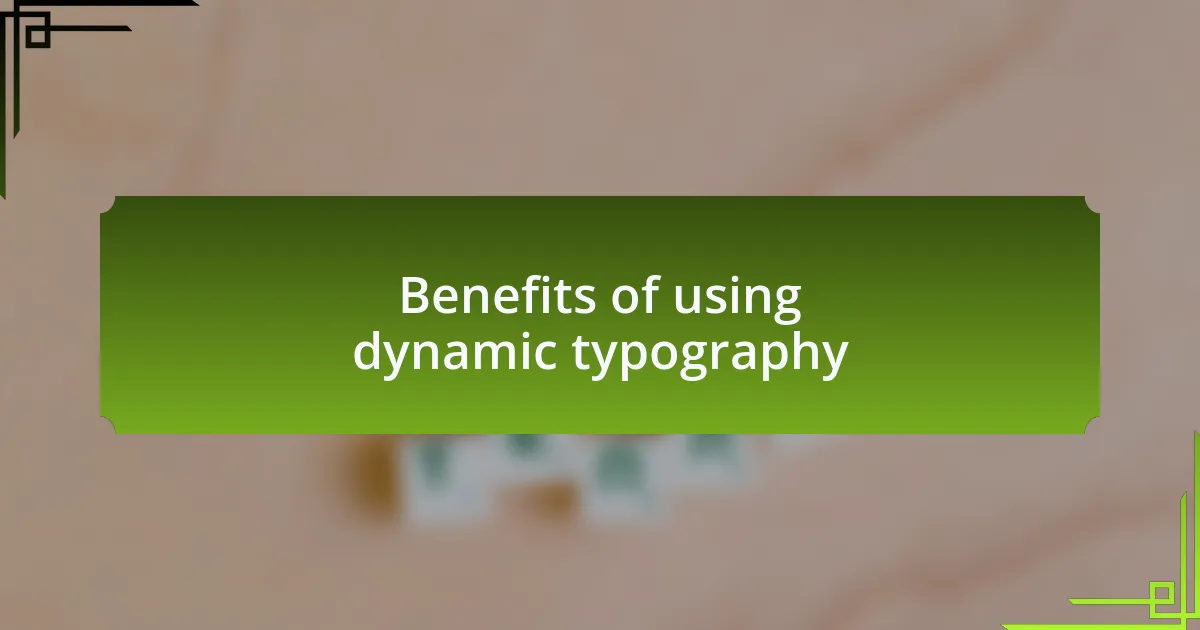 One of the most significant benefits I’ve experienced with dynamic typography is its ability to enhance storytelling. For instance, I once created a digital brochure where the text changed styles and colors to reflect various themes within the narrative. This approach captivated readers and made the information feel more engaging and alive. Isn’t it remarkable how typography can add another layer of depth to our messages?