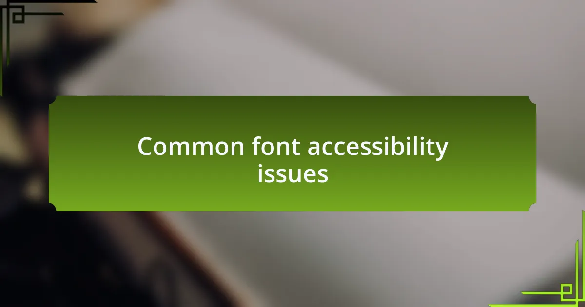 One common font accessibility issue is the use of overly decorative typefaces. I recall a time when I struggled to read a website’s content because the chosen font was ornate and beautiful but utterly impractical. It made me think—what good is aesthetic appeal if it comes at the cost of clarity? This experience highlighted how crucial it is to prioritize readability over appearance, especially when it comes to conveying important information.