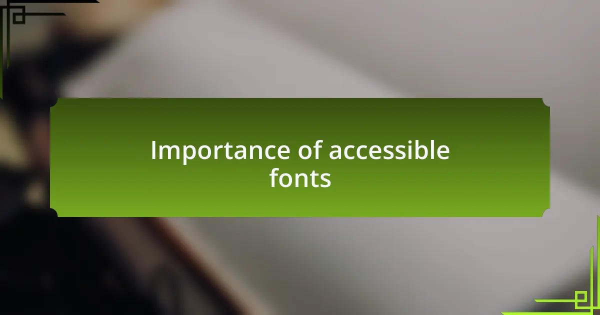 Accessible fonts are crucial for making sure information reaches everyone, regardless of their visual capabilities. I once attended a seminar where the speaker used a beautifully crafted font but forgot about accessibility, leaving many attendees frustrated. It struck me how important it is for designers to prioritize legibility; if the audience can’t read the content, all the design effort is wasted.