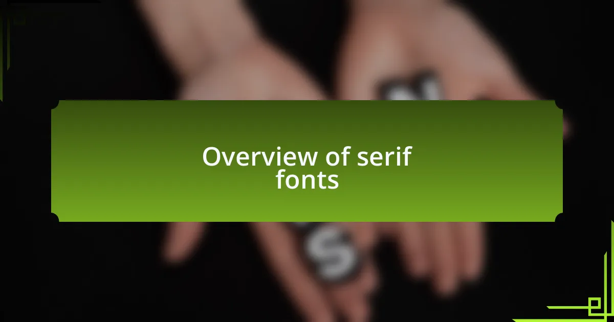 Serif fonts are characterized by their distinct strokes at the ends of each letter, which I find give them a traditional and formal appeal. I recall an instance when I chose a classic serif for a book cover. The effect was immediate; the design conveyed a sense of credibility and sophistication that resonated with readers, almost as if they could feel the weight of the content before even opening the book.