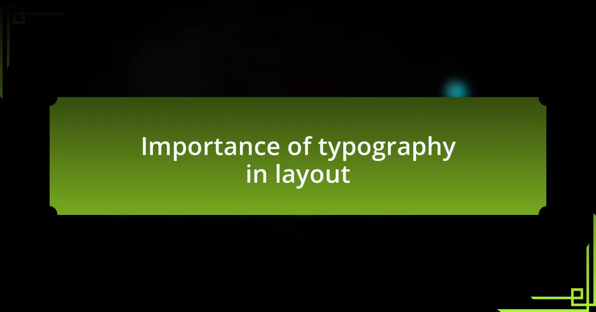 Typography holds immense importance in layout because it sets the overall tone and communicates the essence of your message. I vividly recall a project where I used an elegant script font for a wedding invitation. The typography immediately conveyed joy and celebration, and the compliments flowed in. How powerful is it that the right font choice can spark an emotional connection before the audience even reads a single word?