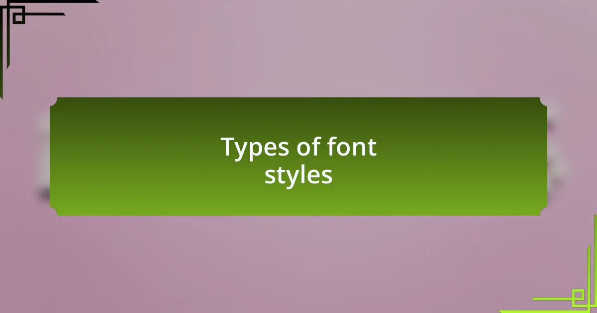 Then there are display fonts, often bold and decorative, which can add personality to a design. I once used a quirky display font for a coffee shop’s promotional material, and I could see how it captured the playful essence of the brand. It’s fascinating to consider how such distinct styles communicate different messages, isn’t it? Selecting the right kind of font style is more than just a design choice; it’s about telling a story that connects with the audience on an emotional level.