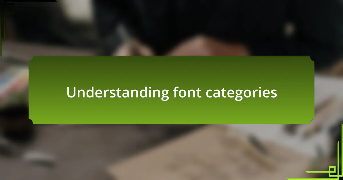 When it comes to understanding font categories, I find it fascinating how they can influence design choices. Fonts generally fall into several categories: serif, sans-serif, slab, script, and decorative, each offering its unique flavor. For instance, I once experimented with a slab serif font for a startup’s branding and found that it made the brand feel more robust, like it had a solid foundation, compared to a floating sans-serif. Why do you think some brands resonate more with one category over another?