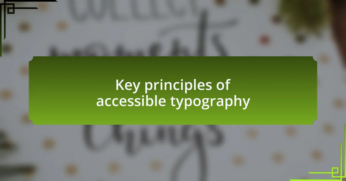 One of the key principles of accessible typography is ensuring appropriate contrast between text and background. I remember a project where I overlooked this aspect, leading to a feedback session where users struggled to read the content. It was eye-opening to understand that simply tweaking color choices could greatly enhance accessibility for those with visual impairments and make the text pop on the page.
