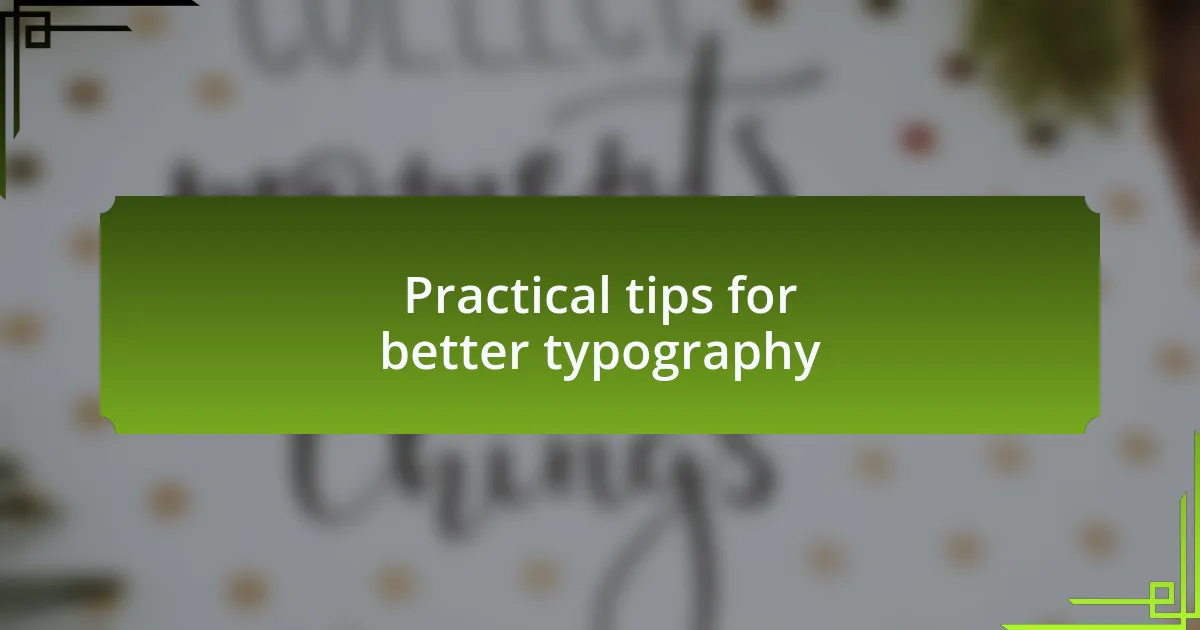 When diving into typography, one practical tip I learned is to establish a clear hierarchy in text. I remember working on a project where the headings and subheadings blended into the body text. It felt like a jumble of ideas rather than a structured narrative. Now, I always ensure that larger and bolder fonts indicate primary headings, guiding the reader through the content effortlessly. Isn’t it satisfying to navigate a site where the structure feels intuitive?