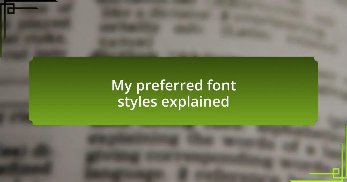 When it comes to my preferred font styles, I often lean toward sans-serif fonts, particularly for digital projects. I vividly remember working on a website redesign, where I chose a clean sans-serif typeface. The result? A modern and airy feel that made navigating the site a breeze. I think there’s something refreshing about the simplicity they offer, don’t you agree?