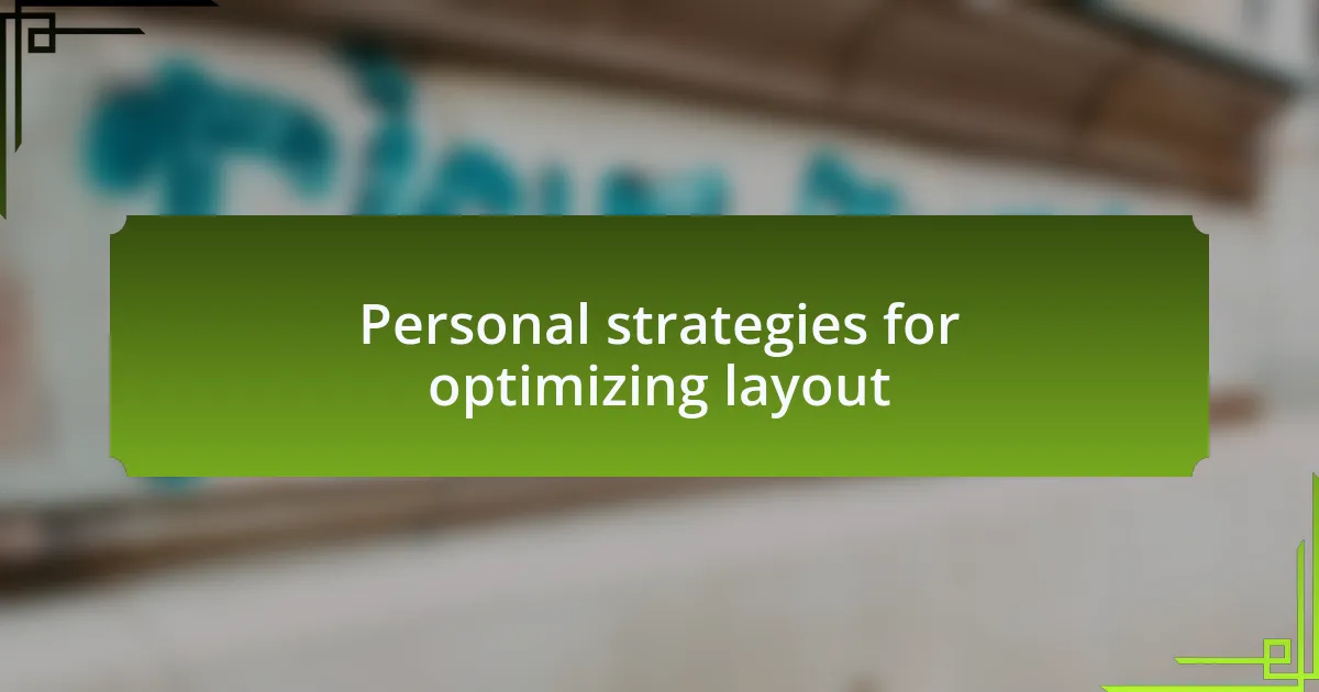One of my favorite strategies for optimizing layout is to utilize a grid system. When I first began using grids, I was amazed at how they helped me maintain alignment and consistency across different sections of my designs. It provides a clear structure that makes the layout feel more cohesive. Have you ever noticed how a well-aligned page draws your eye effortlessly across the content? This technique has definitely helped me streamline my designs and keep them visually appealing.